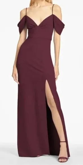 Sachin and Babi. Brittany 4-Way Stretch Crepe Gown. Size: 10 Color: Deep Wine Brand new with tags in new condition. Sachin & Babi Brittany Gown in burgundy, crafted from 4-way stretch crepe for a flattering fit that moves with you. Designed with a sophisticated V-neckline, cold shoulder details, and a thigh-high slit for an elegant silhouette. Features a back zipper closure and a full-length design, measuring approximately 62 inches. Made from 95% polyester and 5% spandex. Perfect as a wedding guest dress or bridesmaid gown. Dry clean recommended. Style F221B21-605. Approximate lay-flat measurements: Waist: 15.75" Underarm to underarm: 17" Length: 61.5" Q9