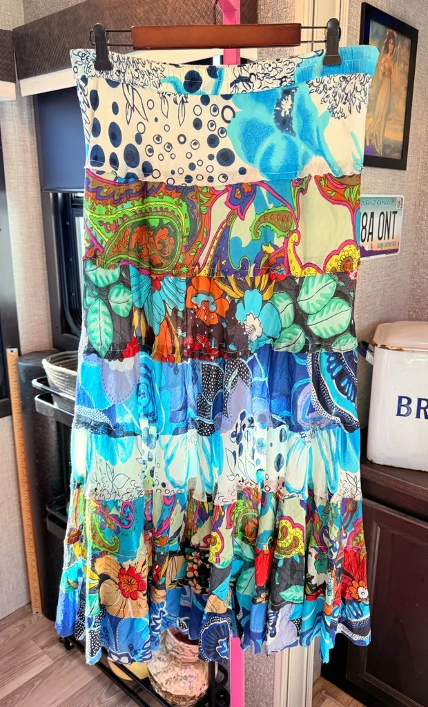 Brighten your look with this vibrant maxi skirt. Features a mix of blue and green patterns. Perfect for a bold statement. Super lightweight and very comfortable - comes from a non smoking hypoallergenic pet friendly RV life. Measurements are in last picture.