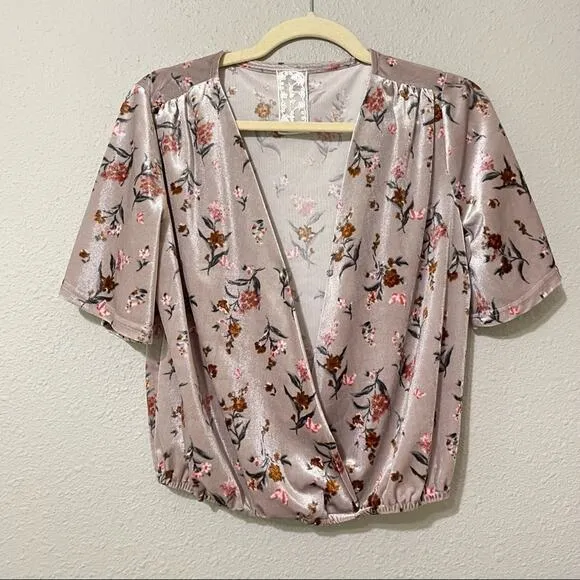Sadie & Sage Grey Floral Velvet Wrap Crop Top Small Small Short Sleeve Romantic Gray - $22 - From Lisa