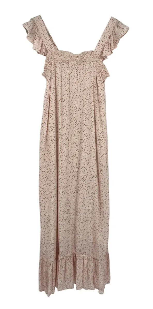Cream Sadie & Sage Floral Polka Dot Maxi Flutter Sleeveless Slip Dress Cottagecore Boho Lady Laranja Peach Polka Dot Sleeveless with ruffles, smocking at top and tier on hem, lined in cream Good Pre-owned condition, please see photos Size Small 100% Rayon Approximate measurements in inches Pit to pit: 15 unstretched Length: 56 Boho, Bohemian, Flutter, Ruffle, Tiered, Cottage Core, Western, Lady Laranja, Sadie & Sage, ruffle strap dress, floral midi dress, cottagecore, prairie, romantic, feminine, soft girl, boho chic, milkmaid, soft aesthetic, light academia, garden party, spring summer dress, picnic dress, ethereal, indie boutique, festival style