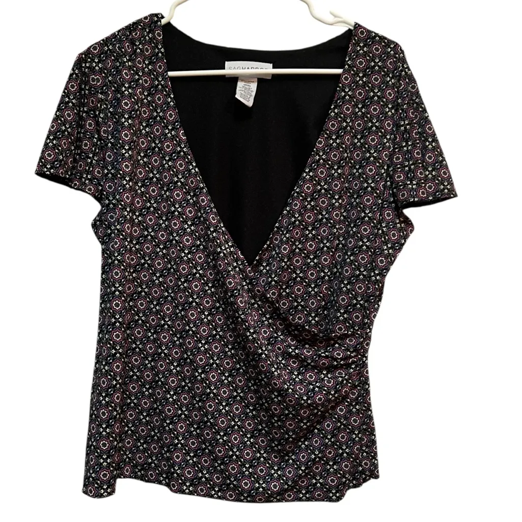 Great condition. Sag Harbor. Faux wrap surplice neck blouse. Short sleeve. Black with pink and white geometric floral pattern. Style T83509. Size large. 100% polyester. Pit to pit laying flat 20” Shoulder to hem 24” Sleeve (seam to hem) 7”. All measurements are approximate and taken lying flat. Smoke free home. No trades, offers welcome.