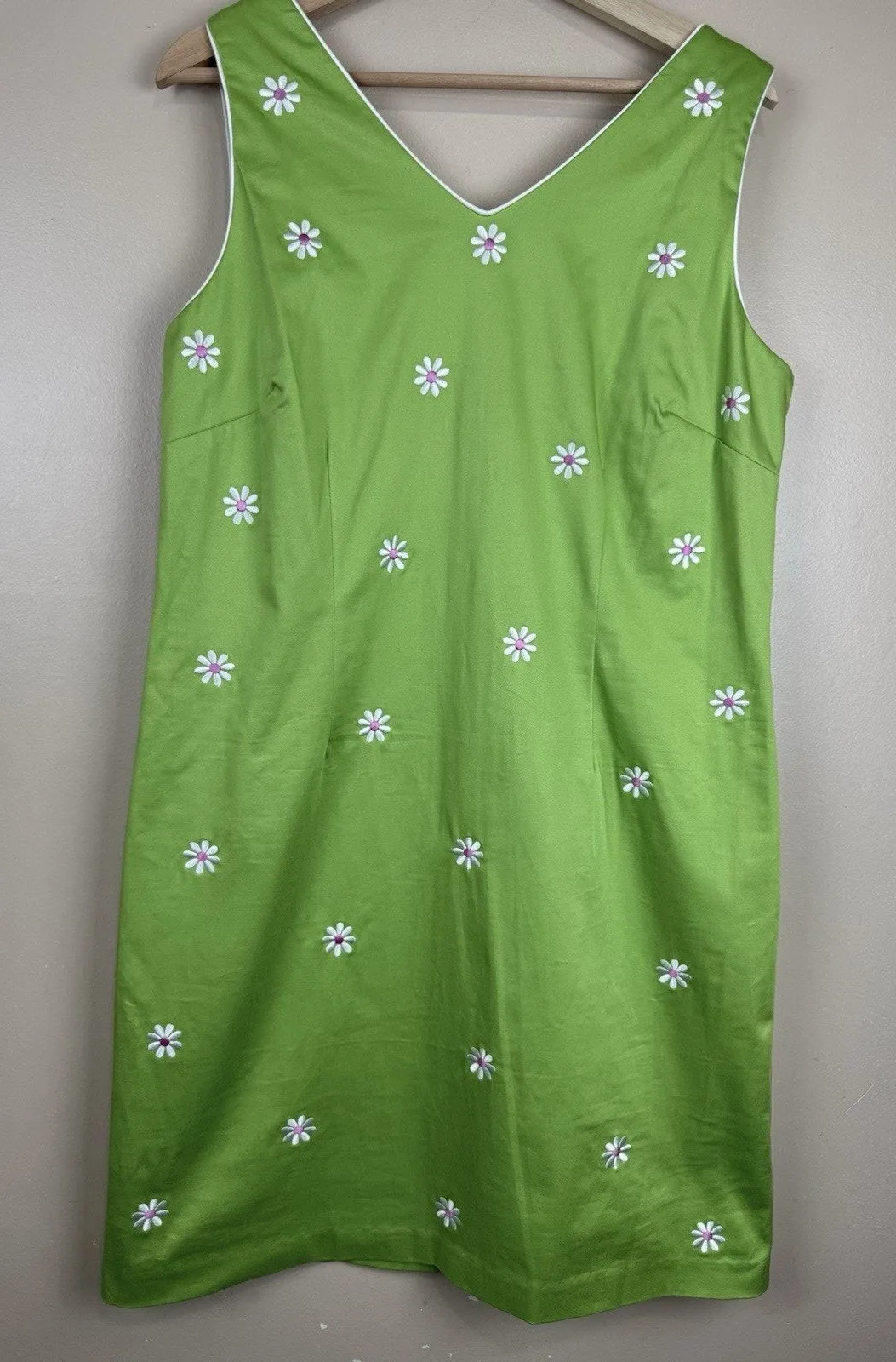 Sag Harbor sleeveless sheath dress in bright lime green with white daisy floral embroidery and pink centers. Features a V-neckline with white trim and a comfortable cotton-spandex blend. Fresh summer look with subtle 90s/Y2K style. Size: 14P (Petite). Please verify measurements before purchasing.
