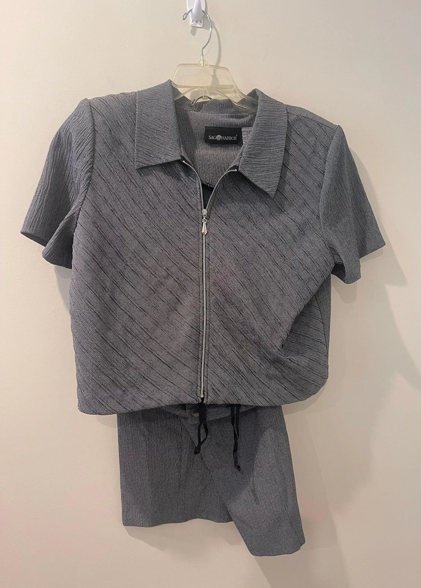 Size: 16 Color: Gray, black, white Blazer: Pit to pit - 23; zip closure; length - 20 Pants: waist laying flat 18; Inseam - 24; elastic waist; side button closure Suit is lightweight No lining