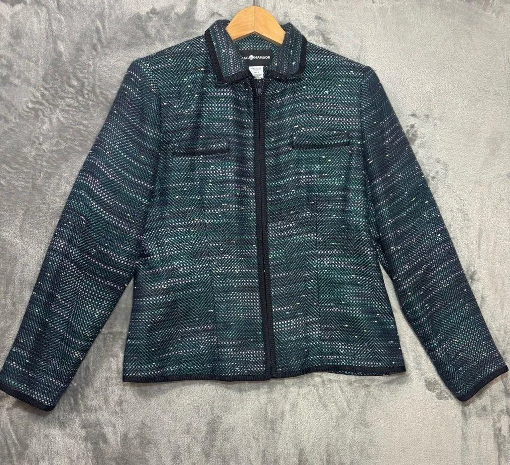 Stylish black/teal/pink/purple/blue woven balzer with zip closure and black woven trim. Fully lined. See photos for measurements. Normal wear. Great for the office and school (teachers and administration). Use as a stylish coat for cool fall nights. See photos for clothing measurements and condition. Any flaws or issues with the item will be identified in the description and pictured in the last photos. Please contact me with any questions. Thank you for your interest and have a great day! F-025