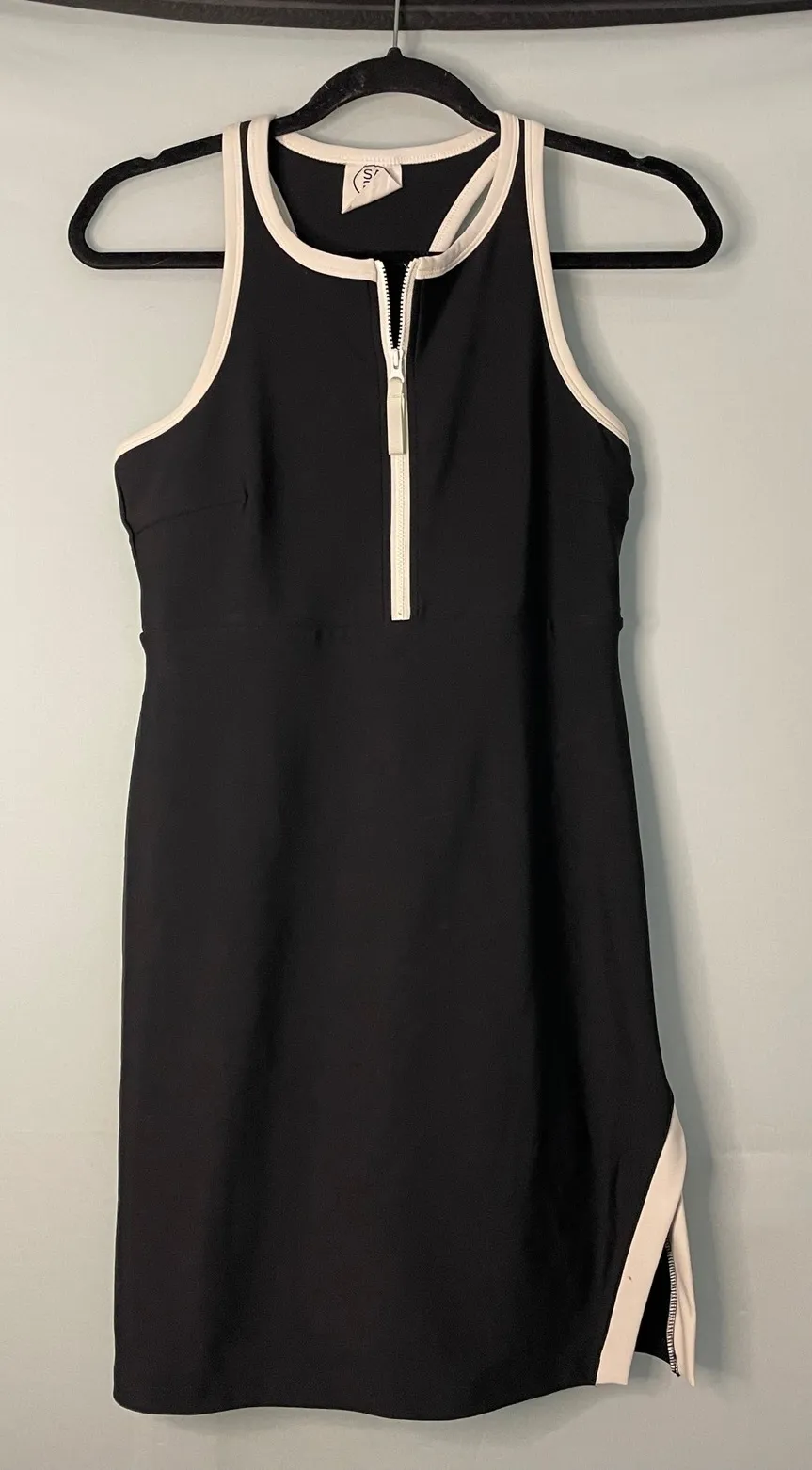 SAGE COLLECTIVE black athletic dress with white trim and a quarter zip neckline. Designed with a rac... Show more