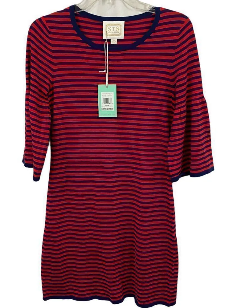 Sail to Sable Red and Blue Striped Knit Bell Sleeve Dress Size XS Ruffle Accents Crew Neckline Stri... Show more