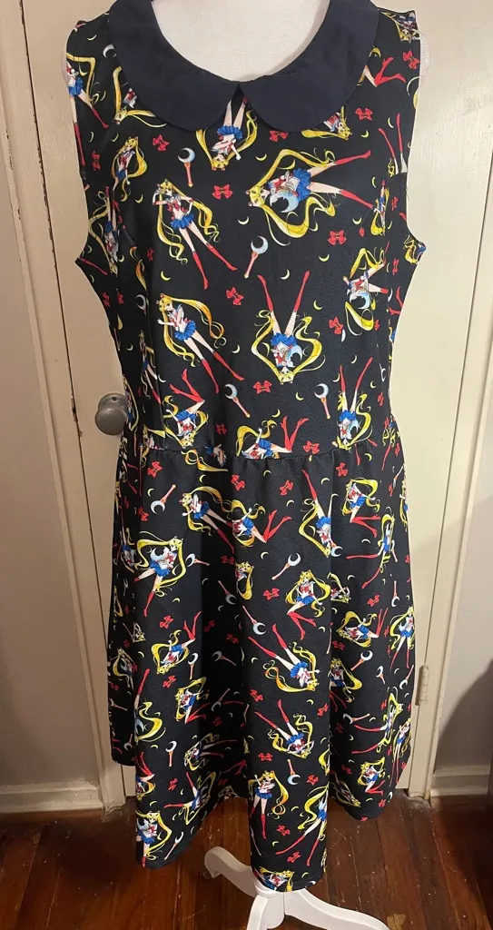 Sailor Moon Crystal navy blue print sleeveless midi dress with Peter Pan collar & keyhole back closure. Size XL. Polyester/spandex blend with some stretch. Fit & flare style. Excellent condition. Measurements approximate. Pit: 20” Waist: 18” Length: 41”