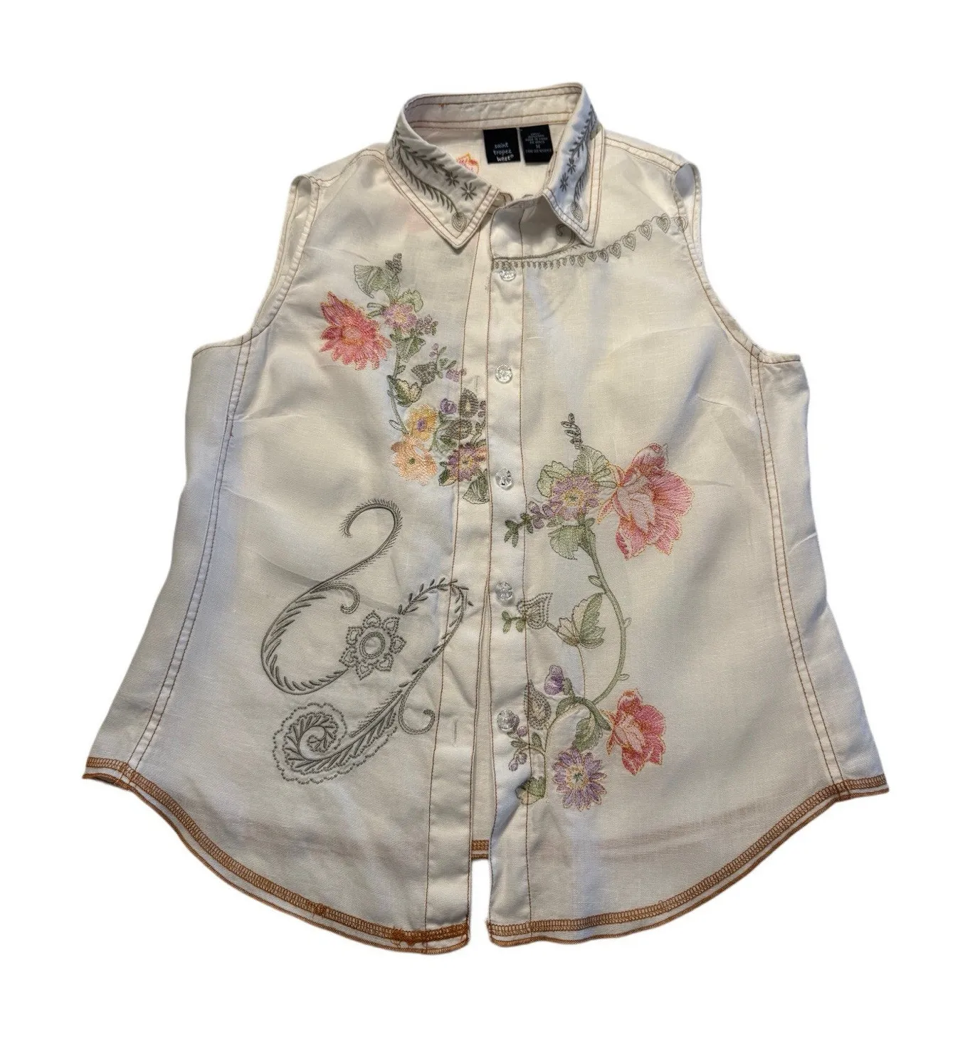 Saint Tropez West Women's LINEN Sleeveless Top/Heavily Embroidered Floral Sz M Great condition Measurements in photos Boho, cottage, beach, vacation, western, dainty, feminine item # 160