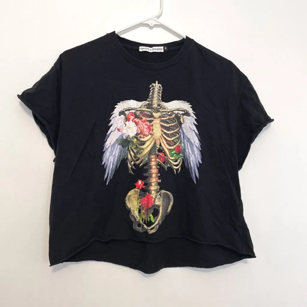 ◇ Saints x Sinners ◇ size medium (assuming womens, by may be mens/unisex - unsure, see measurements below) ◇ graphic t-shirt graphic tee / crop top ◇ solid black with yellow ish / black ish / white / red / blue / green / multi multicolor ribcage skeleton with flowers roses rose flower and angel wings graphic ◇ distressed look / rolled unfinished hem - MAY BE HAND CUT/ALTERED ◇ crew neck and short sleeve ◇ seems to be at least slightly cropped crop length ◇ 100% cotton - machine wash, air dry ◇ approx good used condition overall - lightly fuzzy/pilly; some cracking in graphics (unsure if intentional distressing or due to wash/wear); hem may be hand cut - unsure if it came this way or if it has been altered (may not be perfectly even); relatively faint white ish lines on front near neckline/shoulder area as shown (unsure what they are - may be either fading or faint marks/spots (may vary), haven't tried removing; others not shown are possible) ◇ measurements (flat): (approx, may vary slightly) bust: waist: length: 13,110 ◇ streetwear street wear goth grunge art artist artsy Renaissance art medical med student anatomy anatomical y2k 00s 2000s 90s 1990s retro trendy on trend athleisure activewear loungewear comfy cozy spring summer fall autumn casual every day school weekend errands travel vacay vacation maximalist classic timeless wardrobe staple capsule wardrobe elevated basics quiet luxury twee 2010s 10s Tumblrcore Tumblr