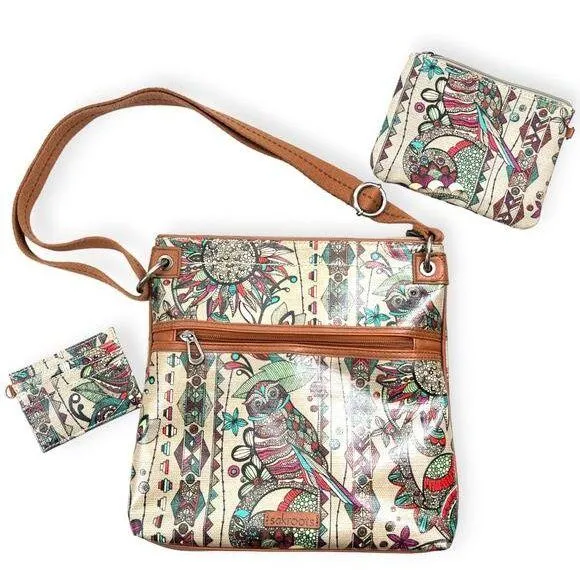 About this item Includes all 3 Pieces - matching sakroots shoulder bag. Fun “peace print” including owls, sunflower and flowers in general. Inside had to pouch pockets and a zippered compartment. The exterior had one large zipper compartment. Antique brass zipper and rings. Measurements 11 1/3” wide X 2 1/4” wide X 11 deep Strap is adjustable and made of fabric. The bag is fully lined, exterior has a wipe easy finish.
