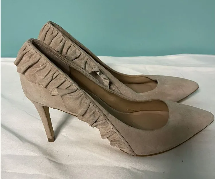 These are Saks Fifth Avenue Beige Suede BOLTON High Heel Stiletto Pumps in size 7 with a pointed toe... Show more