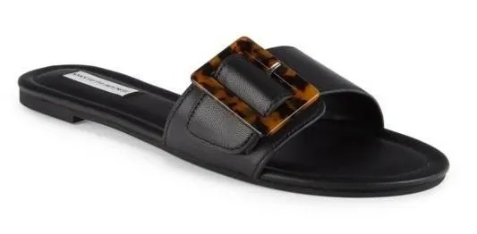 Saks Fifth Avenue black leather slide sandals with a chic tortoise shell buckle accent. These open-t... Show more