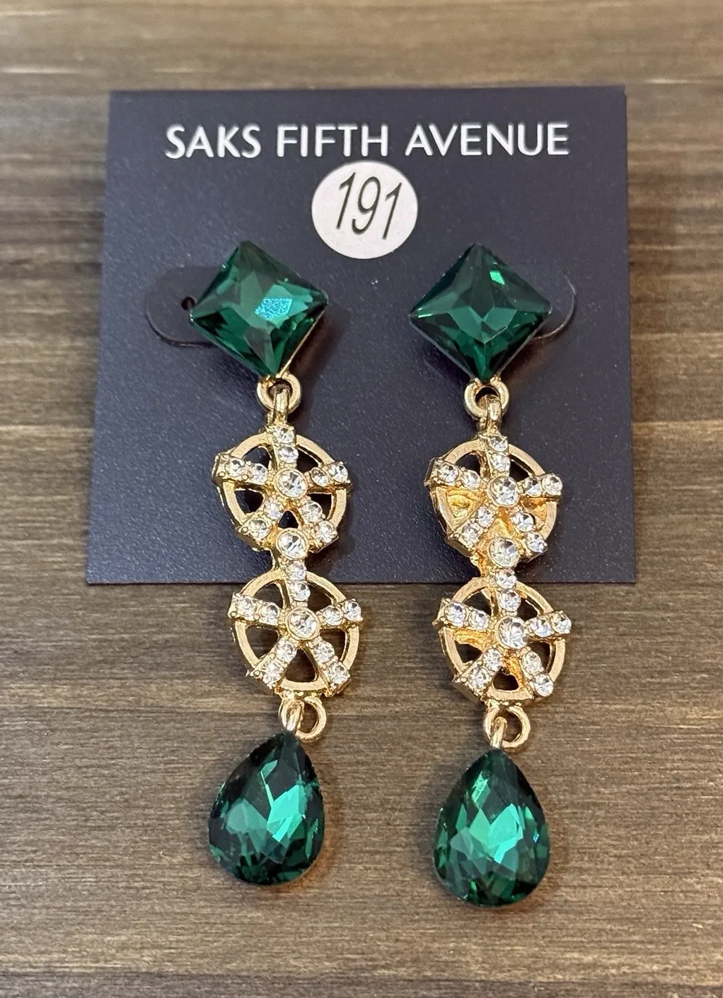 Add some glamour to your outfit with these stunning Saks Fifth Avenue Green Gemstone Water Drop Dang... Show more