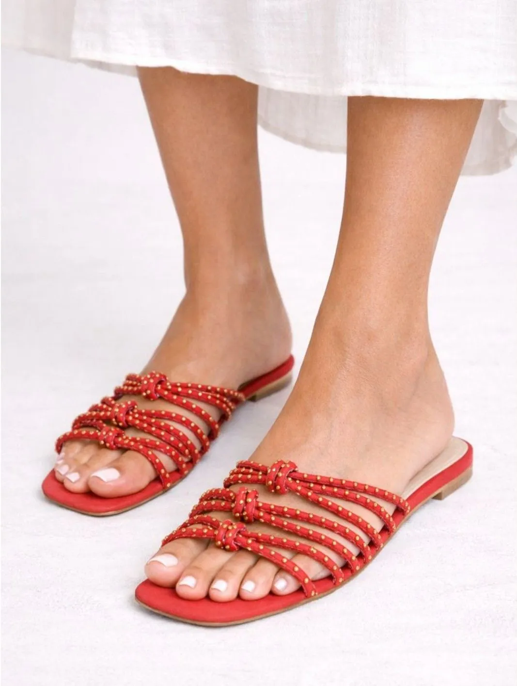 Red suede sandals Knotted, studded straps Mule style EXCELLENT PRELOVED CONDITION, normal wear on so... Show more