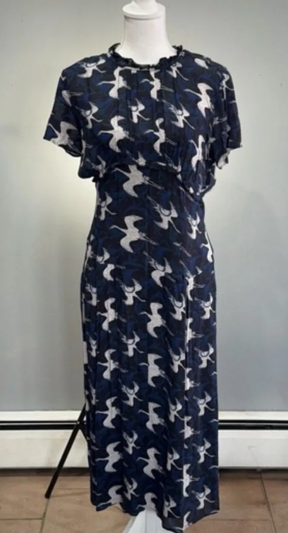 BRAND: Hinge SIZE: XS CONDITION: Like New COLOR: Navy/White MEASUREMENTS: 19.5” pit to pit, 15.5” across waist, 42.5” shoulder to hem MATERIALS: Shell 100% rayon, lining 100% polyester CARE: Machine wash cold NOTES: Back zip, 1940s feel, curved empire waist