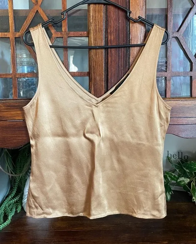 Gleaming satin tank top elevates your everyday style. This sleeveless top features a flattering V-neck design, perfect for layering or wearing on its own. The smooth, luxurious fabric drapes beautifully, offering a comfortable and chic fit. Its versatile design transitions seamlessly from day to night, making it a wardrobe essential. Ideal for a cocktail party, a date night, or a sophisticated brunch. Keywords: sally lapointe, satin tank top, v-neck top, sleeveless top, dressy top, casual top, party top, beige top, gold top, size 4, designer top, luxury top, satin camisole