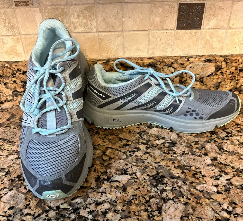 Salomon XR Shift Trail Running Shoes (For Women) sz 10.5 Salomon's XR Shift trail running shoes shift your trail runs into high gear with a lightweight, breathable design that features TPU toe cap and inserts to protect from rocks, and an OS Tendon outsole frame that increases stride efficiency. Breathable and abrasion-resistant nylon mesh upper with synthetic leather overlays for a secure fit Protective TPU toe cap Women-specific last Foam-cushioned, removable insole enhance comfort Moisture-wicking mesh lining Molded-EVA midsole absorbs impact Thermoplastic urethane inserts provide a barrier against sharp rocks underfoot OS Tendon thermoplastic urethane frame along outsole to facilitate better heel-to-toe transitions and push-off efficiency Reflective detailing Contagrip HA® non-marking rubber outsole provides dependable traction on a variety of terrain