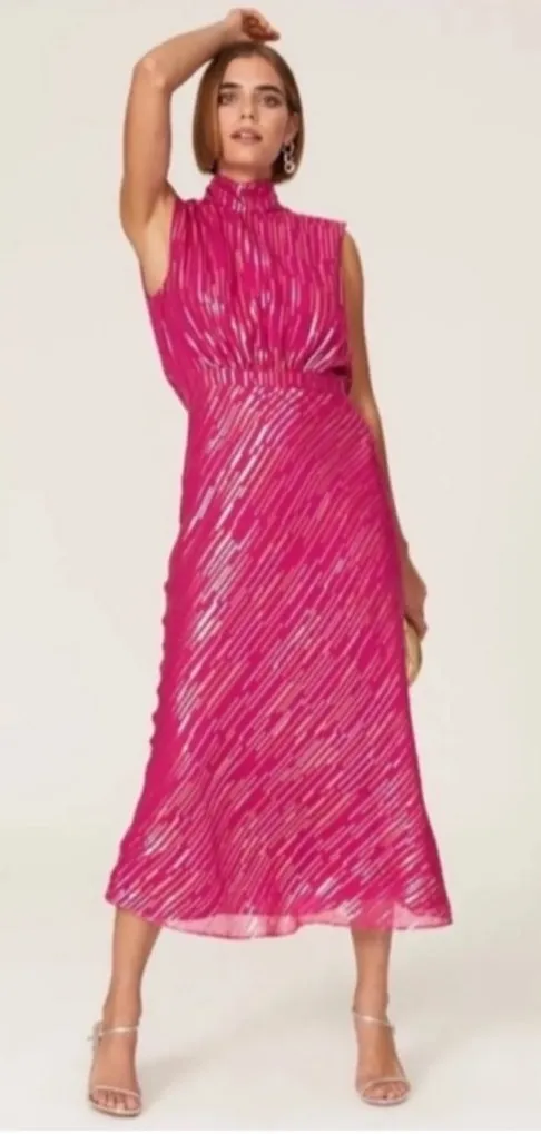 Saloni fleur dress silk metallic fibre Pink Gold Size Drape Open Back 10 Magenta silk (85% Silk, 15% Metallic Fibers), lining (100% Polyester). Blouson. Mock neck. Sleeveless. Back zipper closure. Tencel on this is delicate so pulling up a bit. Tried to picture. Tags: Influencer Statement Piece, bridesmaids, black tie, gala, formal wear, prom, homecoming, pageant, wedding guest, bridal, wedding, bridal shower, mother of the bride, mother of the groom, rehearsal dinner, bachelorette, pageant, prom, homecoming, wedding, engagement photos, special occasion, little black dress, gala, Graduation, holiday parties, pageant, Quinceañera, formal, black tie, cocktail, Maid of honor, Special occasion, Designer Event, Dinner gown, Photo shoot, Formal event, Celebrity Red Carpet Luxe Luxury, Holiday, Vacation Resort wear, Beach dress, Spring, Summer, Fall, Winter, Revolve, FWD, Anthropologie, Designer