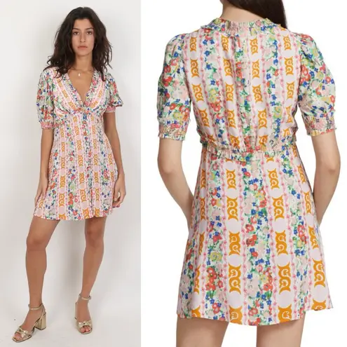 Romantic and effortlessly polished, this Saloni floral print mini dress blends feminine charm with elevated craftsmanship. Designed in a soft baby pink palette with delicate florals and decorative trims, this piece is ideal for spring events, daytime weddings, brunch, or vacation wear. A flattering V-neckline, smocked detailing, and tailored waist create an easy yet refined silhouette that Saloni is known for. Details • Brand: Saloni • Style: Floral print mini dress • Color: Baby pink multicolor • V-neckline • Decorative button embellishments • Smocked and ruffled trim details • Short puff sleeves • Concealed hook-and-zip back closure • Partially lined • Non-stretch, mid-weight crepe fabric Fabric & Care • Outer: 51% Ecovero, 49% Viscose • Lining: 100% Polyester • Dry clean only Size & Fit • Tagged size: UK 8 / US 4 • Mini length • Structured yet comfortable fit Approximate Measurements: • P2P: 17.5” Flat • Waist: 13.5” Flat • Length: 35” Condition • Worn once, professionally cleaned • No visible flaws noted Saloni dress, floral mini dress, baby pink dress, spring dress, puff sleeve dress, smocked waist dress, feminine dress, occasion dress, brunch dress, wedding guest dress, designer mini dress, eco fabric dress, Ecovero dress