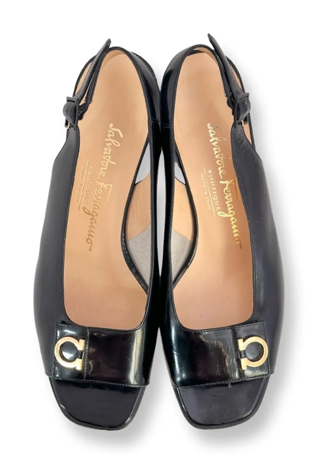 Designer black patent leather open toe sling back sandals with gold horseshoe medallion and 1.5” heel vintage 90’s • Salvatore Ferragamo • Sz 7 • vintage (90’s) • designer sling back sandals • open toe • patent leather • 1.5” heel • horseshoe medallion Condition: 8/10 pre-loved excellent. Some scuffing on heel *see photo*