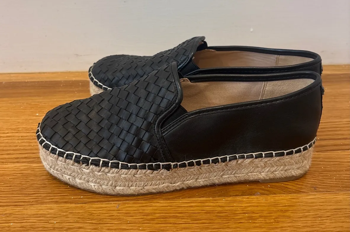 Black woven platform espadrille slip-on flats. These chic flats feature a stylish woven texture acro... Show more