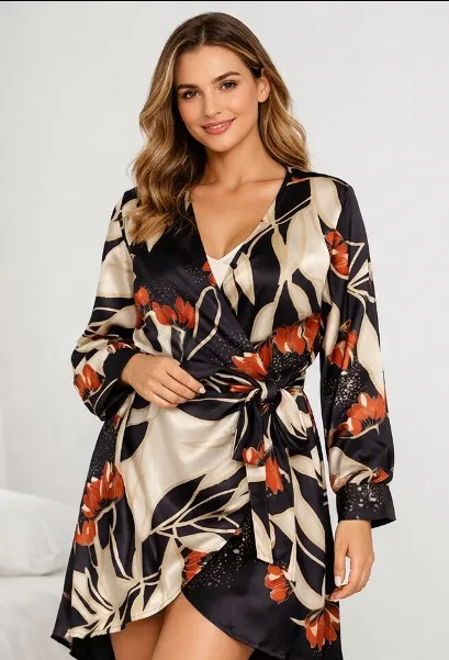 Sam Edelman silky satin wrap robe / kimono-style cover-up in a black, cream/tan, and rust floral pri... Show more
