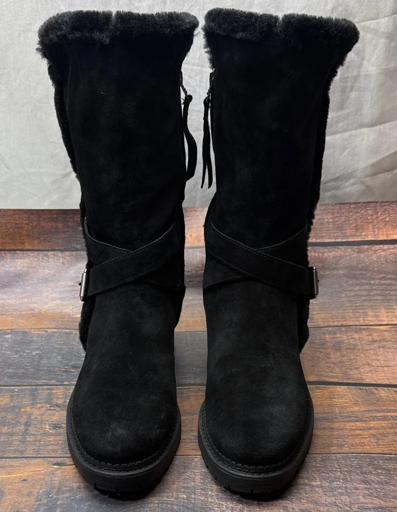 Chic black boots with fur trim. Buckle accent and durable sole. Ideal for fashionable outings. Genui... Show more