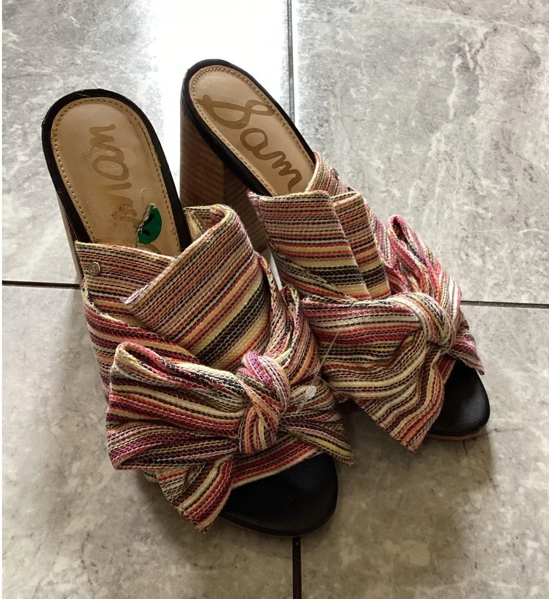 Brand: Sam Edelman Model/Style: YUMI knotted bow slide mule with block heel Size: Womens US 7.5 M... Show more