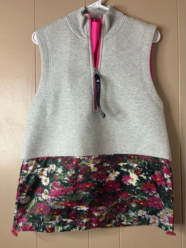The product is a Sample adidas by Stella McCartney Run Gilet in gray and floral design, specifically in size small. Made from a blend of cotton, polyester, and spandex, this lightweight and padded vest features a half-zip design and drawstring adjustable detail. Perfect for running and versatile for any occasion, this stylish piece from the Run Gilet product line exudes a loose fit and a soft shell construction, ideal for active women looking for both comfort and style in their outerwear. Has some discoloration on back. See p