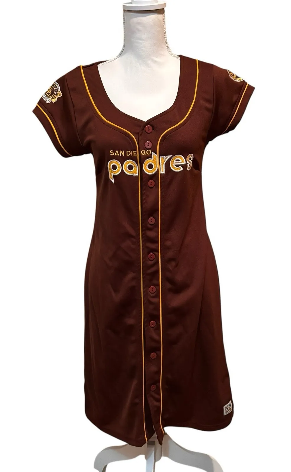 San Diego Padres Women's Jersey Dress Cooperstown Collection Brown MLB commemorative sleeve patches celebrating the 1978 San Diego All-Star Game. Brand: Cooperstown Collection by Gill & Carl Banks • Team: San Diego Padres (MLB) • Style: Button-front jersey dress • Color: Brown with gold accents • Short sleeves • Embroidered front logo • Commemorative All-Star Game patches on sleeves • Officially licensed MLB apparel Women's Large Armpit to armpit 17 inches Length 37 inches