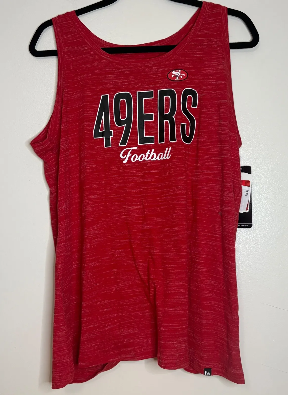 Vibrant addition to any 49ers fan's wardrobe: a stylish red tank top. This sleeveless shirt proudly displays '49ERS Football' across the front, complete with the team's logo and 'San Francisco' on the back. Perfect for game days, casual outings, or hitting the gym, showcasing your team spirit with a trendy flair. Color: Red Department: Women Type: Tank Style: Basic Features: Breathable, Twist Hem, Sleeveless Neckline: Scoop Neck Performance/Activity: Gym & Training, Walking, Football Sleeve Length: Sleeveless Fit: Regular Closure: Pullover Strap Type: Wide Strap Character: Football Player, Athlete Keywords: 49ers tank top, San Francisco 49ers, NFL tank top, women's tank top, red tank top, New Era tank top, football tank top, sleeveless shirt, team apparel, game day shirt, sports fan apparel, casual tank top, womens nfl, football shirt, nfl shirt