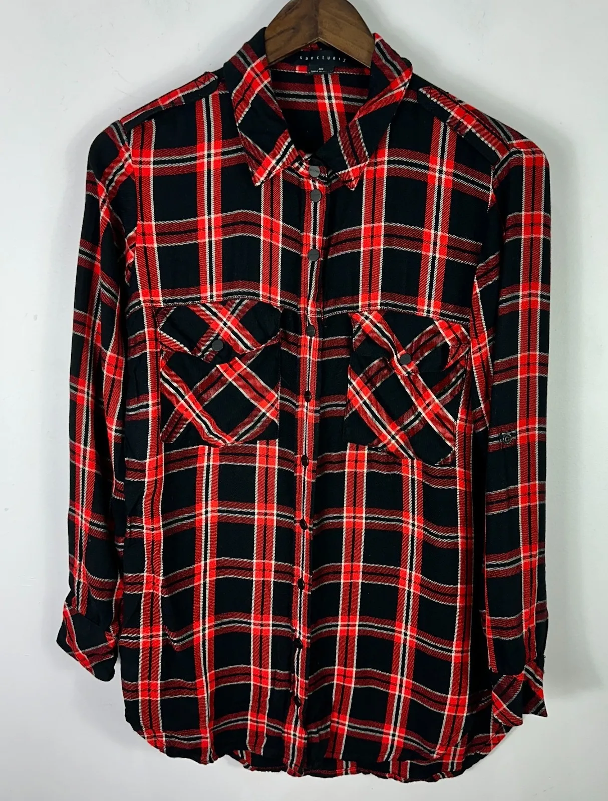 * Size XS * 100% Rayon * Red & black plaid pattern * Snap Button front * Relaxed boyfriend f... Show more