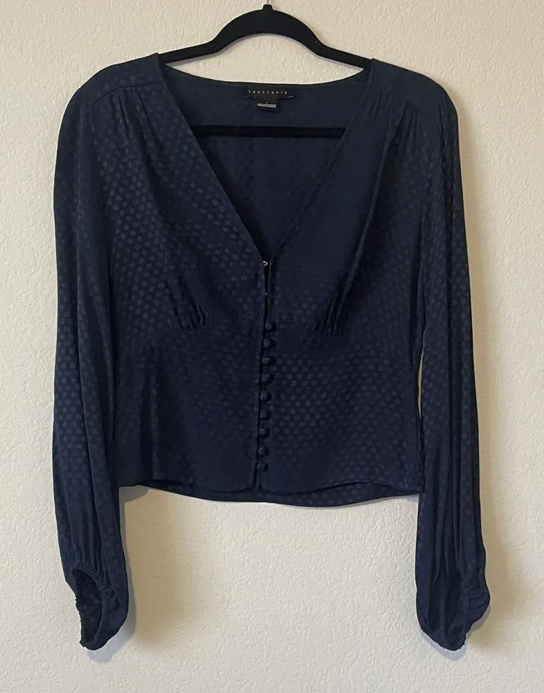 Chic navy blouse with button-front detail. Long sleeves and textured fabric. Size Small NWOT