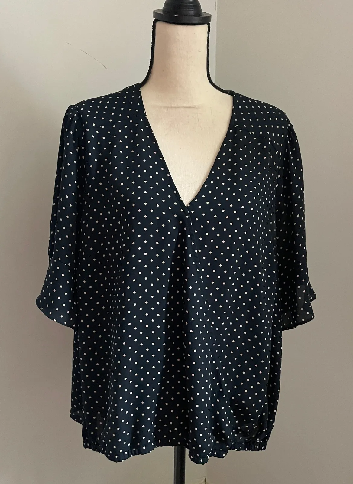 Measurements: • Chest (pit to pit): 23 in • Length (shoulder to hem): 26 in Type: Blouse Department... Show more