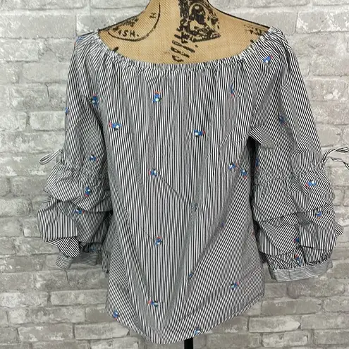 Ties above ruffled folds from elbow to cuff Elastic off-the-shoulder neckline Floral embroidery thro... Show more