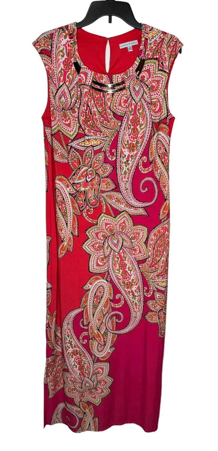 Brand- Sandra Darren Material- 95% Polyester/5% Spandex Size- 14 Color- Orange/Pink Gold Neck Plate Measurements: Armpit to armpit- Under the arm measurement- 18.5" Shoulder to shoulder- Shoulder seam to shoulder seam- 17" Length- From bottom of collar to the end of the dress- 54" Condition: Pre-owned, very good used condition. See Photos. Thank you for Shopping. Feel free to check out my listings for various preloved items.