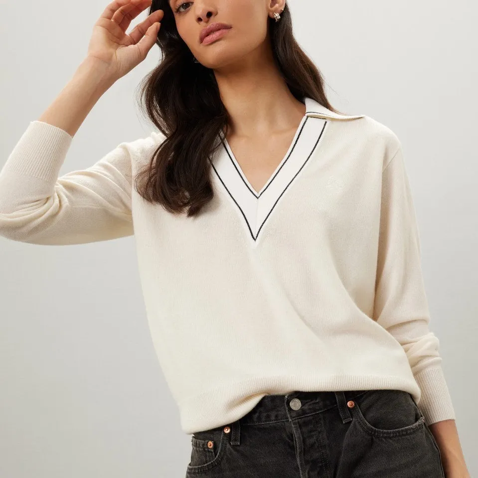 Preowned. Some markings on one side of the collar. See photo. Color: cream and white Size: SOA 2 (4-6 US) Retail: $338 Retro prep is the name of the game in this varsity style polo sweater by Sandro. Style with distressed jean shorts for a nostalgic summer look. Off-white knit (93% wool, 7% cashmere; Collar: 59% viscose, 41% polyamide). Sweater. Long sleeves. V-neck. Pull on. 24" from shoulder to hemline. Tags: Sandro sweater, Sandro Paris sweater, Sandro knit sweater, Sandro v neck sweater, French brand sweater, designer sweater, luxury knitwear, neutral sweater, cream sweater, minimalist sweater, Parisian style, elevated basics, chic casual sweater, work outfit, office outfit, everyday outfit, date night outfit, weekend outfit, fall sweater, winter sweater, layering piece, capsule wardrobe, effortless style