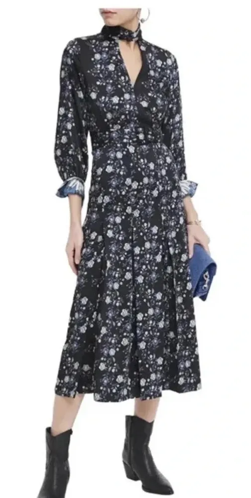 SANDRO BONNY CUT OUT BLUE FLORAL SATIN MIDI DRESS - $225 - From Justine