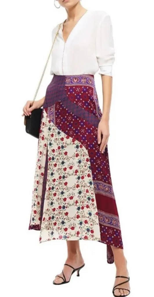 Sandro Paris Dua Asymmetric Patchwork Maxi Skirt Small Approx Measurments: Waist 13" Length 32.5" • Fits small, order one size up • Designed for a slim fit • Model measurements: 5'10" height, 33.5" bust, 23.5" waist, 34.5" hips, wearing a Sandro size 1/S • A-line silhouette • Allover mixed-print patchwork construction • Asymmetric hem • Concealed side-zip closure at left hip • Imported • 100% viscose; patchwork contrast: 100% polyester • Dry clean • Good condition / see photos (stain near the bottom)