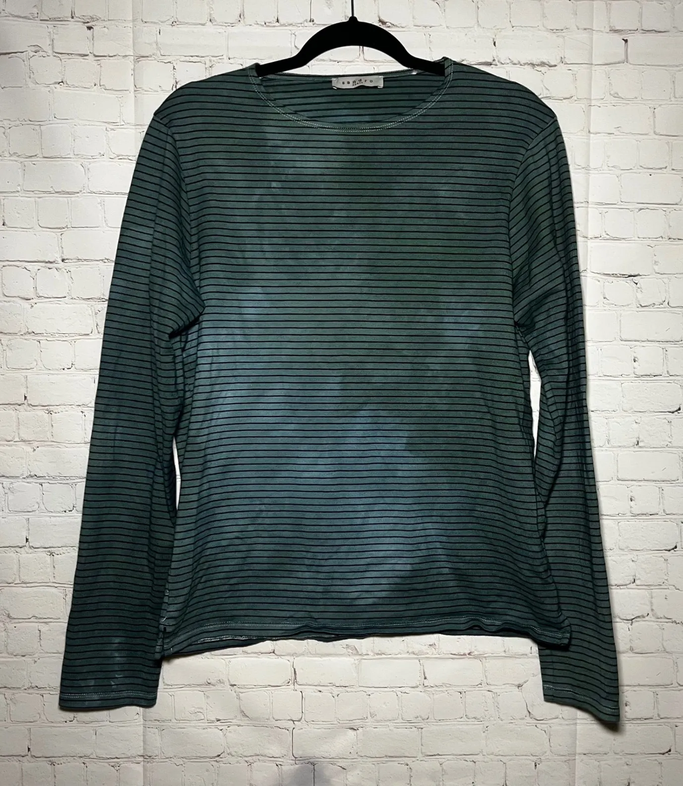 Excellent used condition. Please note size was cut off but measurements say it's a Large. Sandro Paris women's long sleeve crew neck top in a green Tie dye and black stripe pattern. Features a unique tie-dye effect throughout the fabric for added visual interest. The neckline is a classic crew style, and the sleeves are full length. The fabric is soft and comfortable, perfect for everyday wear. Measurements: • Chest: 19 in • Length: 26 in Type: T-Shirt Department: Women Style: Basic Material: 100% Cotton Neckline: Crew Neck Sleeve Length: Long Sleeve Sleeve Type: Classic/Fitted Sleeve Pattern: Striped Features: Breathable, Lightweight, Stretch Fit: Regular Fabric Type: Knit Occasion: Casual Closure: Pullover Season: Spring, Fall, Summer Unit Type: Unit Keywords: Sandro Paris, striped, long sleeve, crew neck, tie dye, casual, basic, everyday, comfortable, Parisian style, designer, fashion, apparel