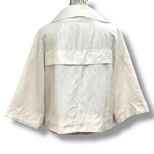 The Sandro Sportswear Size XL Ivory Linen Cropped Jacket is a stylish and versatile addition to any wardrobe. Made from a comfortable linen blend with a polyester lining, this short jacket features a solid ivory color and a relaxed fit. With 3/4 sleeves and a zip closure, it is perfect for various occasions, from casual outings to business meetings. The jacket's lightweight and breathable design make it ideal for the warmer seasons, adding a touch of luxury to your look.