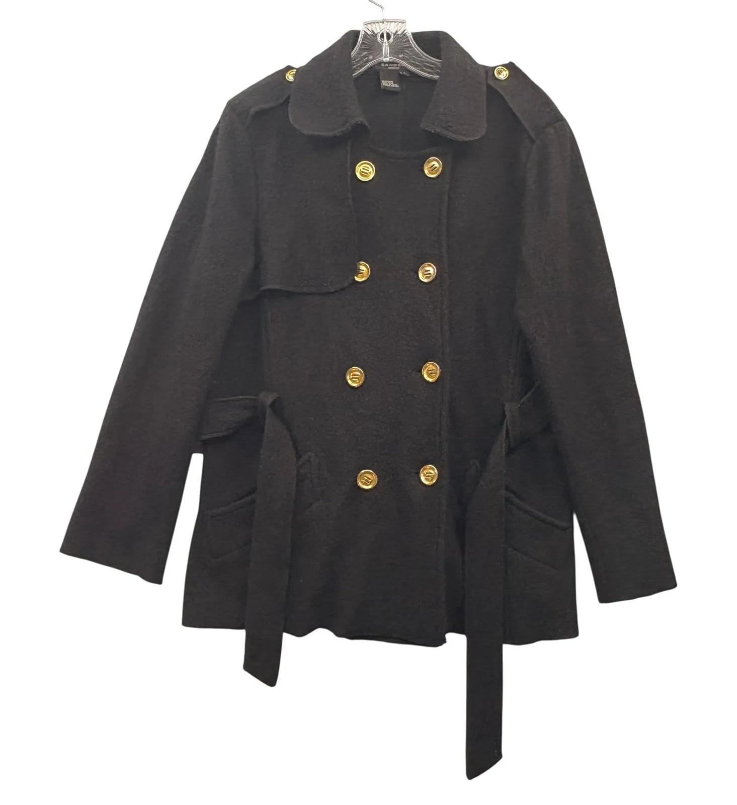 Sandro Sportswear Womens Black Wool Blend Military Style Tie Belted Coat Gently Used Chic black coat from Sandro Sportswear, a distinctive piece offering both style and functionality. This coat features a double-breasted front with striking gold-tone buttons, lending a military-inspired aesthetic. The design incorporates stylish epaulettes and a notched collar, enhancing its structured silhouette. Practical elements include side pockets and a tie belt to cinch the waist for a flattering fit. The coat is fully lined, ensuring comfort and warmth, making it a versatile addition to any wardrobe. Size Large Approximate Measurements: 28" Length 20" Pit To Pit 25" Sleeve Length Classic, Chic, Minimalist, Structured, Polished, Statement, Timeless, Fall, Elegant, Military-Inspired Feel Free To Ask Questions Or Request More Photos! SKU: 0012