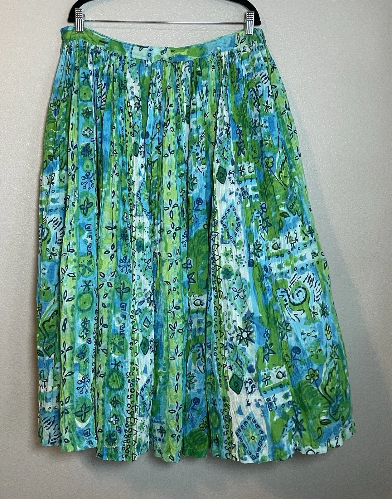 The Sandy Starkman Large Blue Green Prairie Boho Crinkle Broomstick Long Maxi Skirt is a vintage-ins... Show more