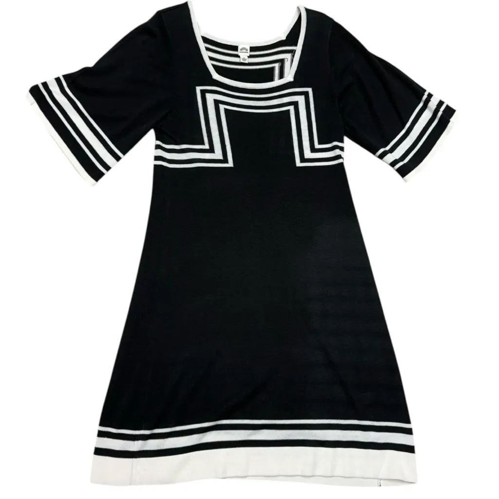 Chic black and white knit dress by Sangria featuring a bold geometric pattern that frames the neckli... Show more