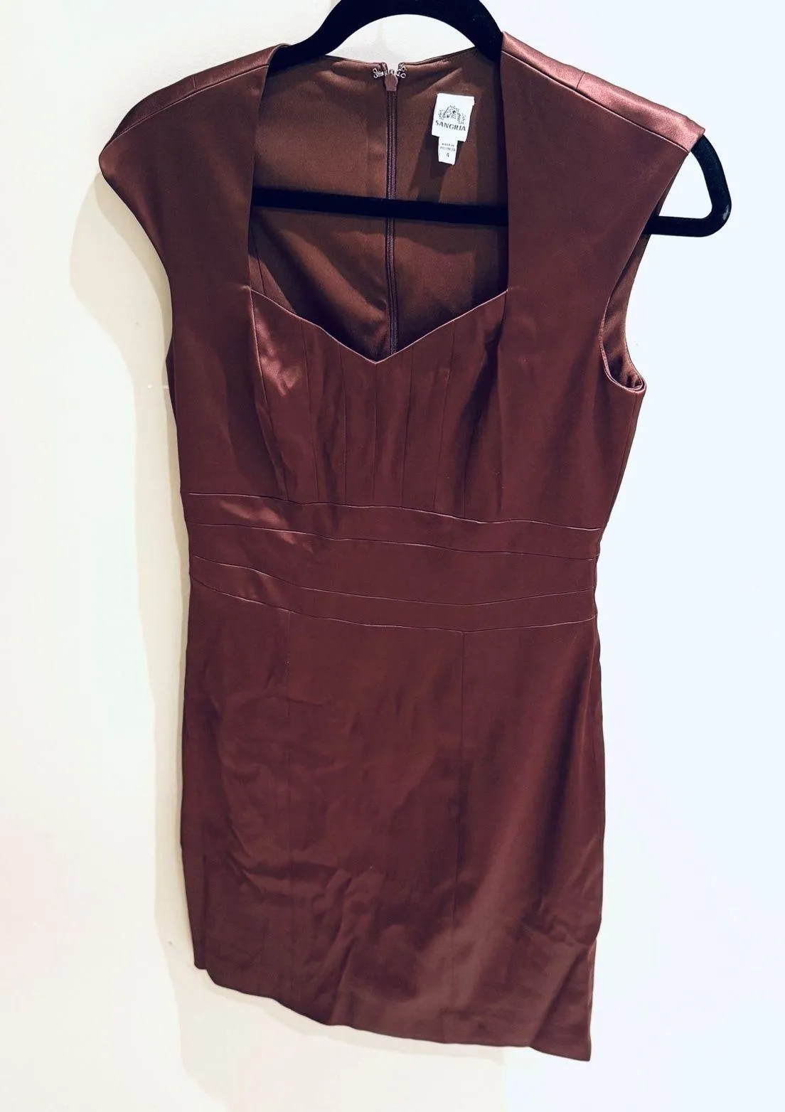 A sophisticated and stylish dress, perfect for a variety of occasions. This brown dress features a flattering sweetheart neckline and cap sleeves, creating a classic and elegant silhouette. The fitted sheath design accentuates the figure. Style: Sheath Dress Length: Knee Length Color: Brown Department: Women Pattern: Solid Occasion: Business, Casual, Party/Cocktail, Workwear Sleeve Length: Short Sleeve Material: Satin Neckline: Sweetheart Fabric Type: Satin Character: Elegant, Classic, Sophisticated, Career, Party Season: Fall, Spring, Summer, Winter Keywords: brown dress, sheath dress, sweetheart neckline, cap sleeve dress, fitted dress, cocktail dress, party dress, Sangria dress, size 4 dress, womens dress, dress, formal dress, career dress, elegant dress