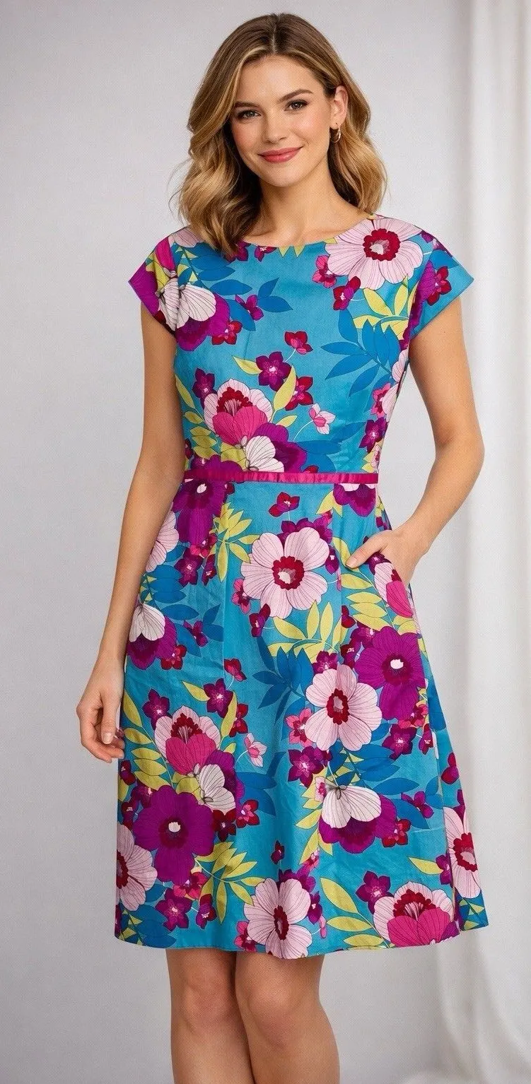 Beautiful Sangria womens fit and flare dress in a vibrant tropical floral print. Features a turquoise blue background with pink, magenta, and yellow flowers, cap sleeves, round neckline, defined waist with contrast trim, and hidden side pockets. Made from a comfortable cotton stretch blend with full polyester lining. Perfect for spring, summer, vacation, resort, brunch, or garden parties. Size: 10 Fabric: 98% Cotton / 2% Spandex | Lining 100% Polyester Made in: Sri Lanka Condition: Good pre-owned condition. Bright turquoise blue base with pink, magenta & yellow tropical floral print Cap sleeves Round neckline Defined waist with pink trim belt detail #Cottagecore # Retro Inspired # Brunch Babe # Garden Party # Resort core # Vacation #Bright Floral Measurements: Please see pictures for accuracy: - Shoulder: 15' - Underarm: 17' - Length: 39' A-line / fit-and-flare silhouette Fully lined