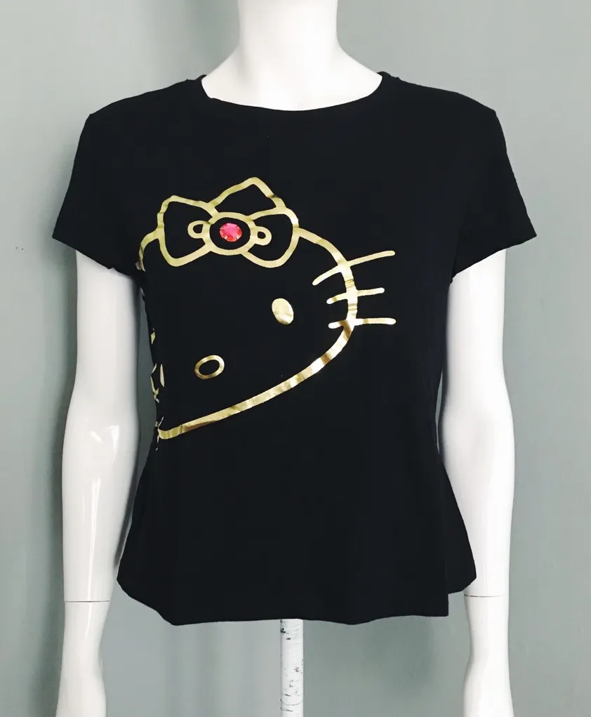 Black t-shirt with gold metallic Hello Kitty screenprint on front. Red faux gem adornment at the center of bow. Capped sleeves, fitted silhouette. 100% Cotton Excellent pre-owned condition, may be new without tags. No flaws or defects to note. Shoulders: 16” Bust: 19” Waist: 17” Length: 20” Sleeve Length: 5” Tagged size XL. Please see approximate measurements to ensure accurate fit. Manufactured by Doe for Sanrio. Circa early 2000’s.
