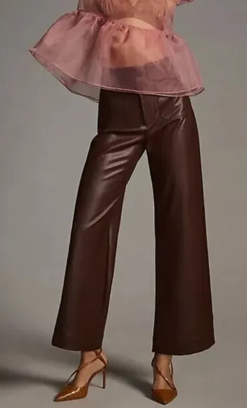 NWT never worn Bloggers favorite High rise faux leather chocolate pants, featuring; Front and back patch pockets, front zipper and button, Bloggers favorite vegan leather in dark chocolate color, belt loops, smooth soft fabric. STOCK PHOTO ONLY FOR STYLE PURPOSE , smoke pets free environment, fast shipping. Color may vary by device screen and light. 55% polyurethane, 45% cotton, prop 65 california warning label as many furniture, food, clothing etc about their exposures to chemicals. Chocolate faux leather wide leg pants, open leg:,11” pleather pants, vegan leather high waist pants