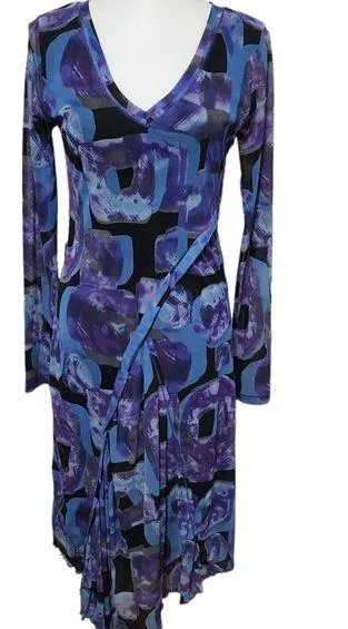 Crafted from a lightweight mesh in a tonal blue geometric pattern, this dress features a vneck, long sleeves, assymetric ruffle running down the front, and gathered fabric at the bottom. Size 6 lined stretch 17" bust 41" length 100% nylon