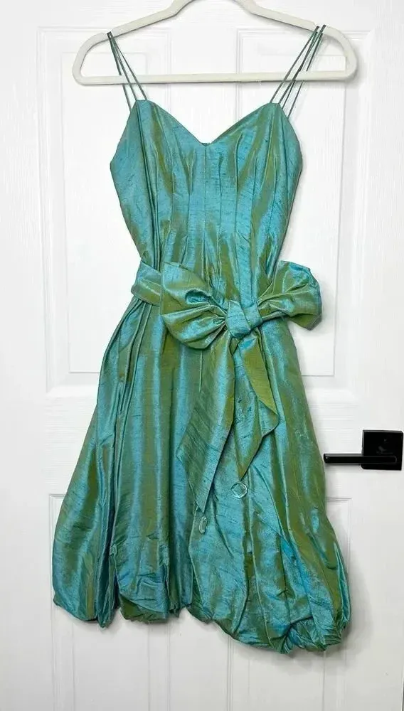 Beautiful silk dress in eye catching blue green turquoise with an iridescent sheen. Sweetheart neckline and double spaghetti straps with bubble hem. Fully lined, belted with crystal ends. Perfect party dress. *Size 2, approx: -16” armpit to armpit -14” waist -38” length *Silk wedding guest, mermaid, special occasion, cocktail